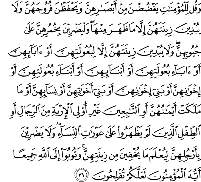 ذكر الآية الرابعة: قوله تعالى "ولا يبدين زينتهن إلا ما ظهر منها". قال ابن مسعود رضي الله عنه هو الرداء. وقد زعم قوم أن هذا نسخ بقوله "والقواعد من النساء اللاتي لا يرجون نكاحا فليس عليهن جناح أن يضعن ثيابهن". أخبرنا المبارك بن علي قال أبنا أحمد بن الحسين قال أبنا البرمكي قال أبنا محمد بن إسماعيل قال بنا أبو بكر بن أبي داود قال بنا محمد بن قهزاد قال بنا علي ابن الحسين بن واقد قال حدثني أبي عن يزيد النحوي عن عكرمة عن ابن عباس رضي الله عنهما "وقل للمؤمنات يغضضن من أبصارهن" نسخ ذلك واستثنى من قوله "والقواعد من النساء اللاتي لا يرجون نكاحا" إلى قوله "ليعلم ما يخفين من زينتهن" وكذلك قال الضحاك. وهذا ليس بصحيح لأن الآية الأولى فيمن يخاف الافتتان بها وهذه الآية في العجائز فلا نسخ